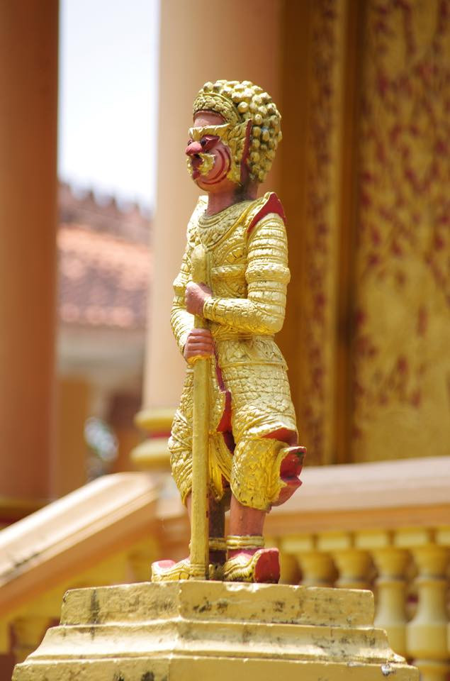 位于寺院中央的正殿底座分为三层,四周有彩色围栏围绕。屋顶边缘有一蜿蜒的龙像。围绕主殿的走廊的柱子头上都有一尊张开双翅的神鸟(Krud)雕像。神鸟是自然界中不存在的瑞鸟,但在高棉族神话和宗教建筑中大量出现。长期以来,神鸟形象与南方高棉人民的精神审美生活紧密相连。正殿内有包金木柱,上面刻有释迦牟尼佛的生平和佛教教义的图像。最引人注目的是佛陀坐像,坐在灿烂的莲花台上,时而隐藏,时而显现出电光晕,营造出威严、宁静和玄幻的氛围。