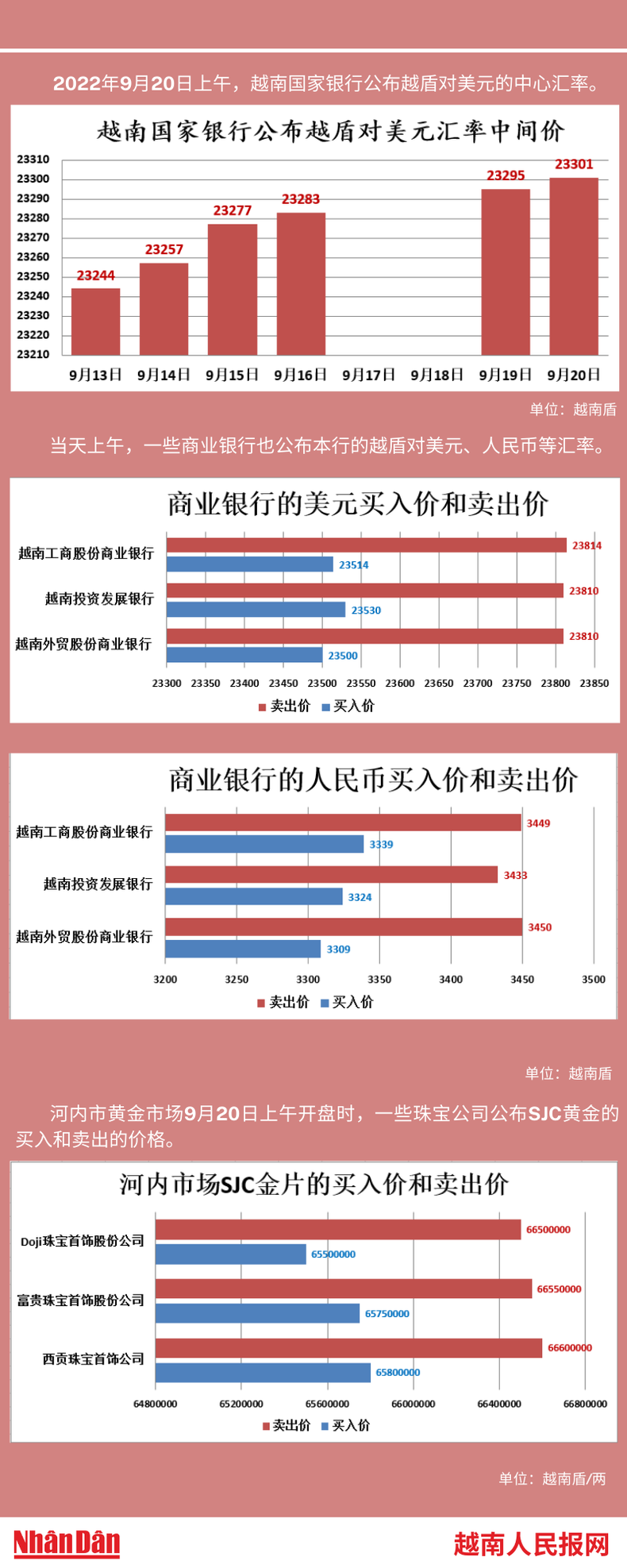 2022年9月20日上午,越南国家银行所公布的越盾对美元的中心汇率为23301。