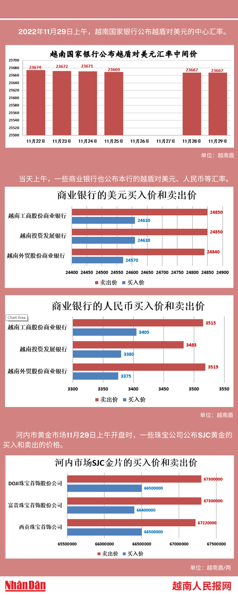 2022年11月29日上午,越南国家银行所公布的越盾对美元的中心汇率为23669。