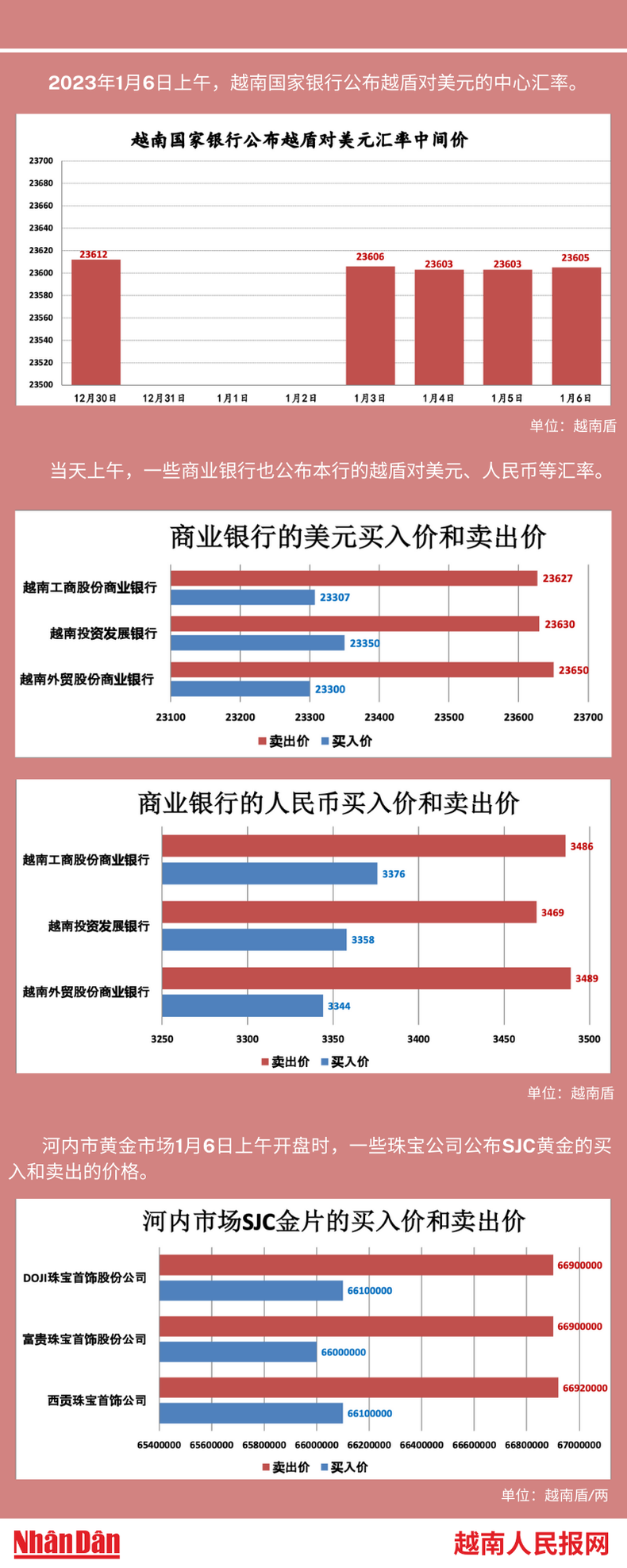 2023年1月6日上午,越南国家银行所公布的越盾对美元的中心汇率为23605。