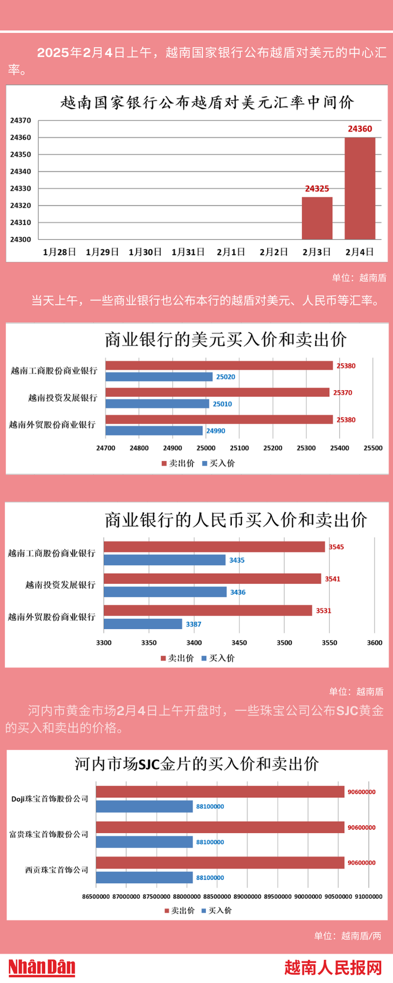 2025年2月4日上午,越南国家银行所公布的越盾对美元的中心汇率为24360。