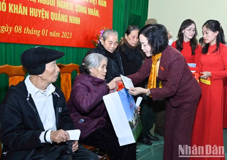 国会主席王廷惠和广平省委书记武大胜向广宁县抚恤政策家庭、贫困户送春节礼物。