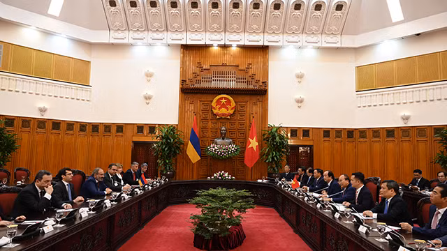 7月5日下午,越南政府总理阮春福与亚美尼亚总理尼科尔•帕什尼扬在坦诚和友好气氛中进行会谈。两位总理对未来进一步促进越南与亚美尼亚各领域合作的许多方向和措施达成一致。
