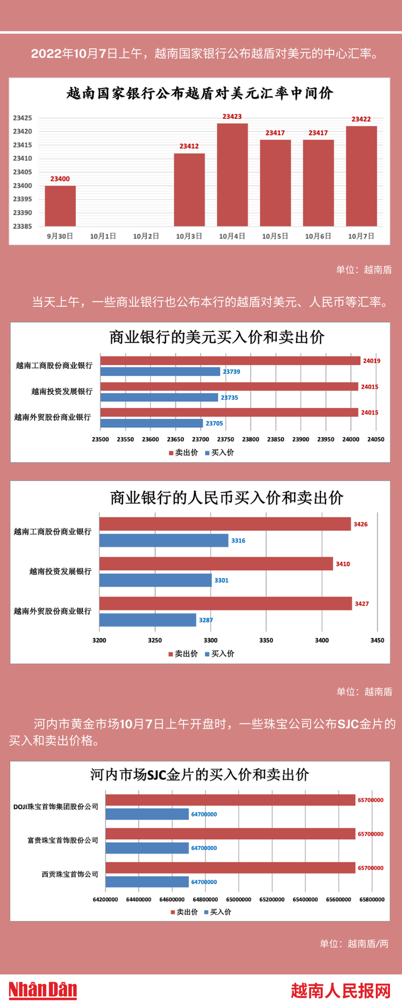 2022年10月7日上午,越南国家银行所公布的越盾对美元的中心汇率为23422。
