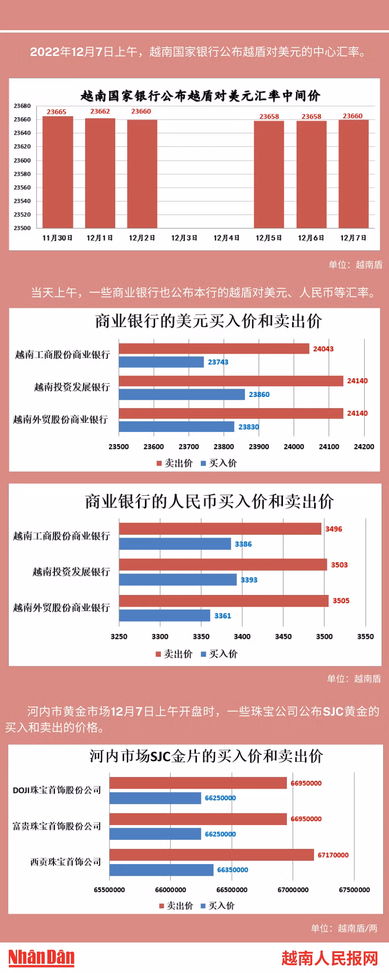 2022年12月7日上午,越南国家银行所公布的越盾对美元的中心汇率为23660。