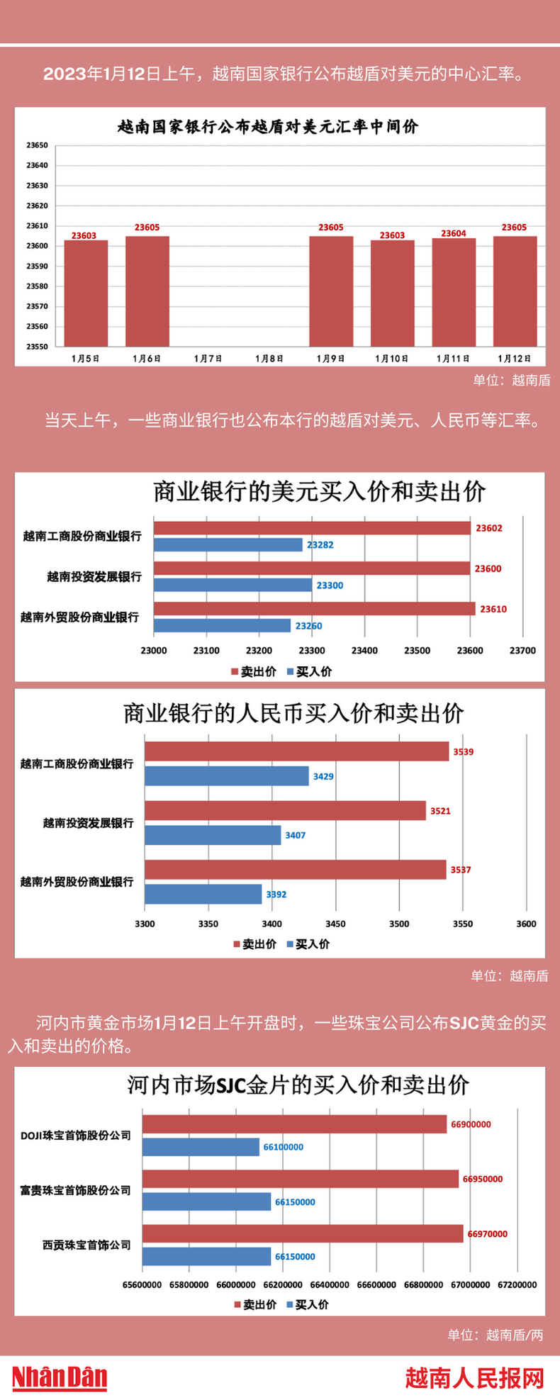 2023年1月12日上午,越南国家银行所公布的越盾对美元的中心汇率为23605。