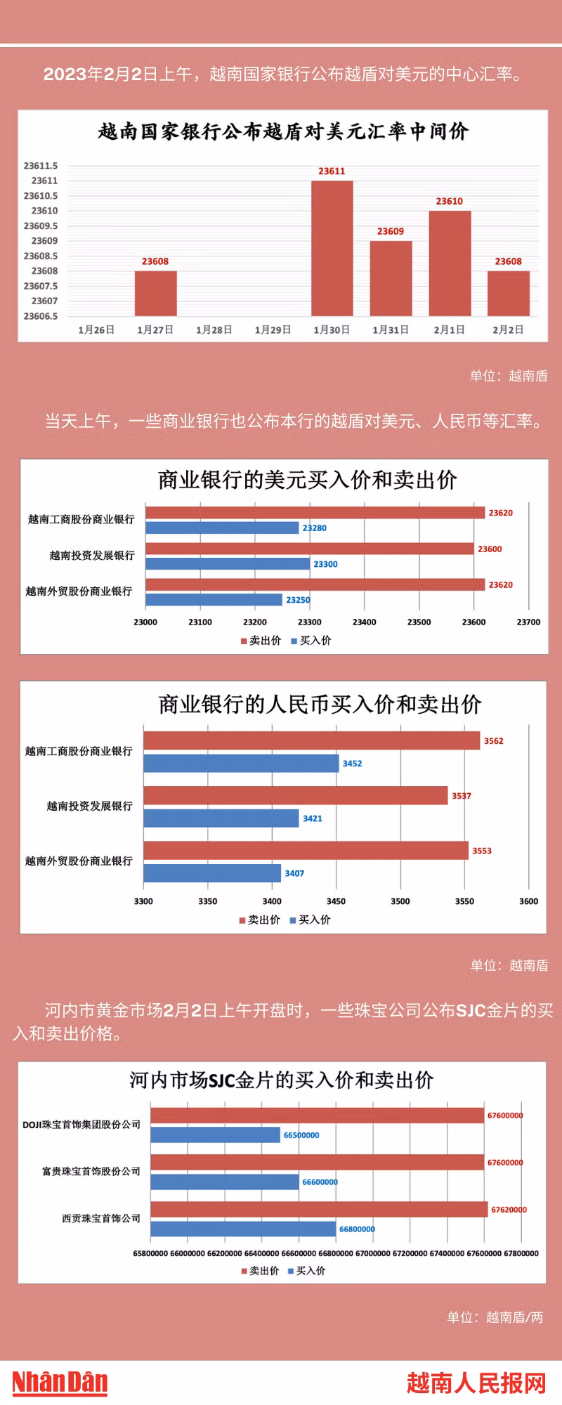 2023年2月2日上午,越南国家银行所公布的越盾对美元的中心汇率为23608。