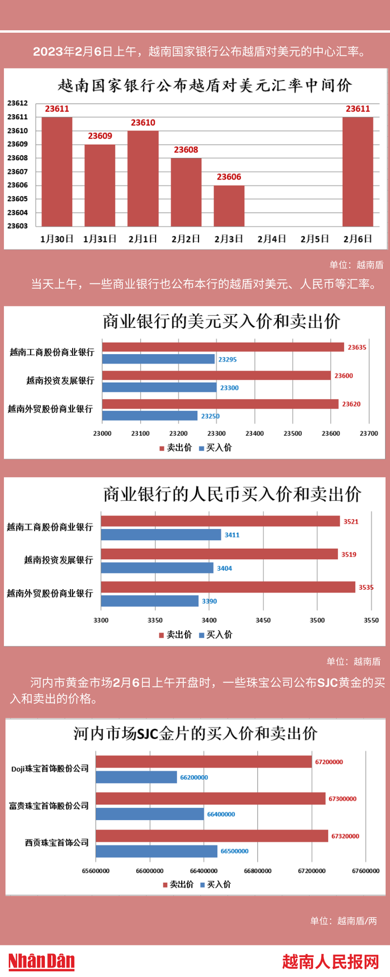 2023年2月6日上午,越南国家银行所公布的越盾对美元的中心汇率为23611。