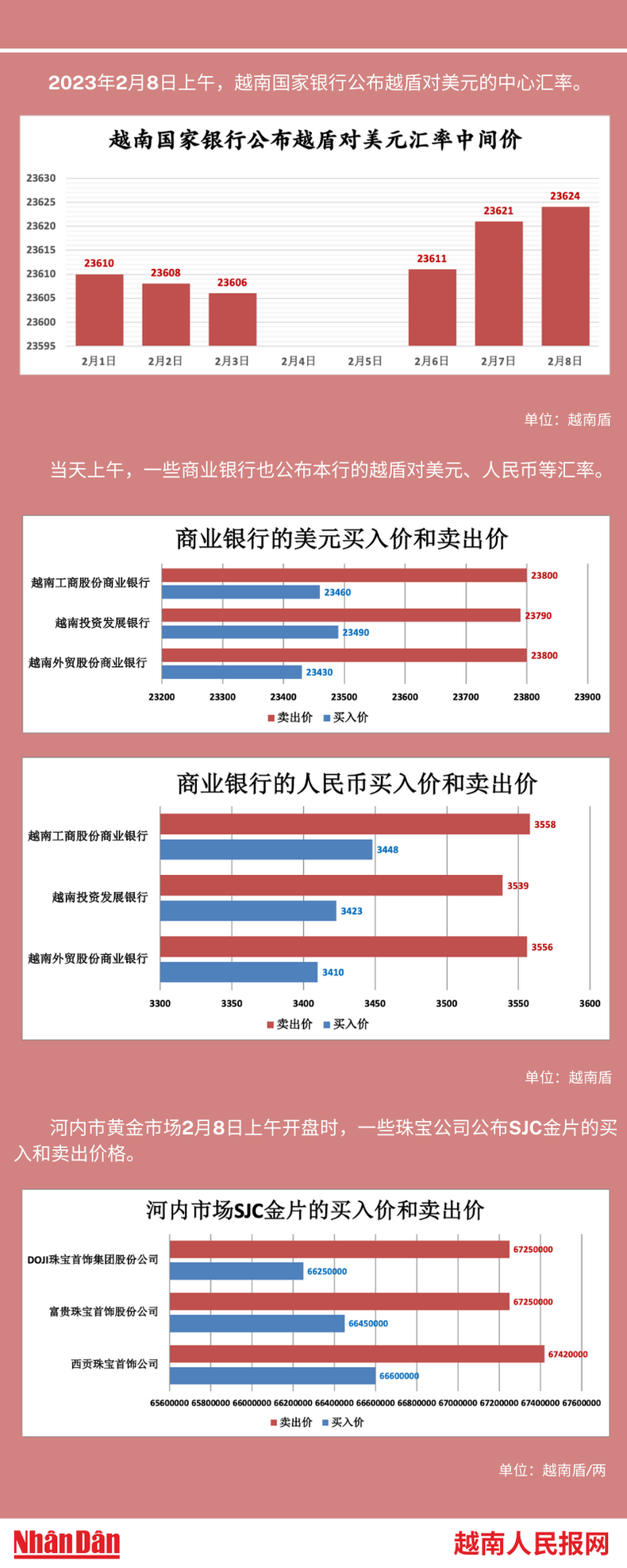 2023年2月8日上午,越南国家银行所公布的越盾对美元的中心汇率为23624。