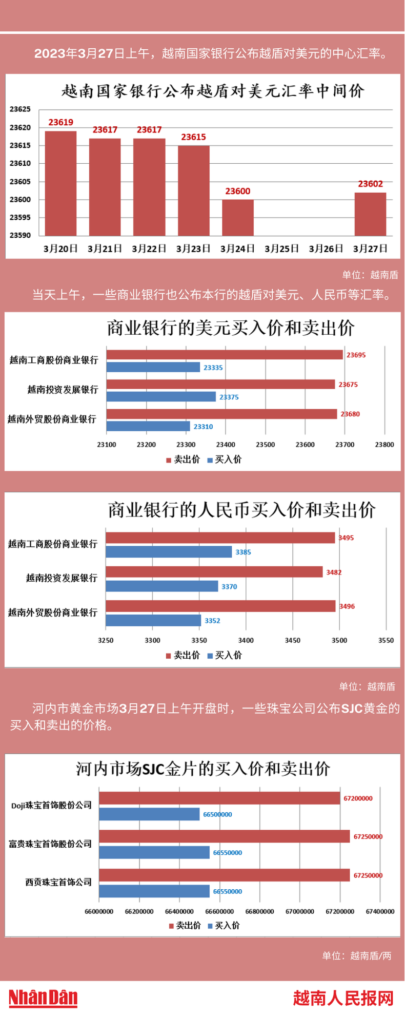 2023年3月27日上午,越南国家银行所公布的越盾对美元的中心汇率为23602。