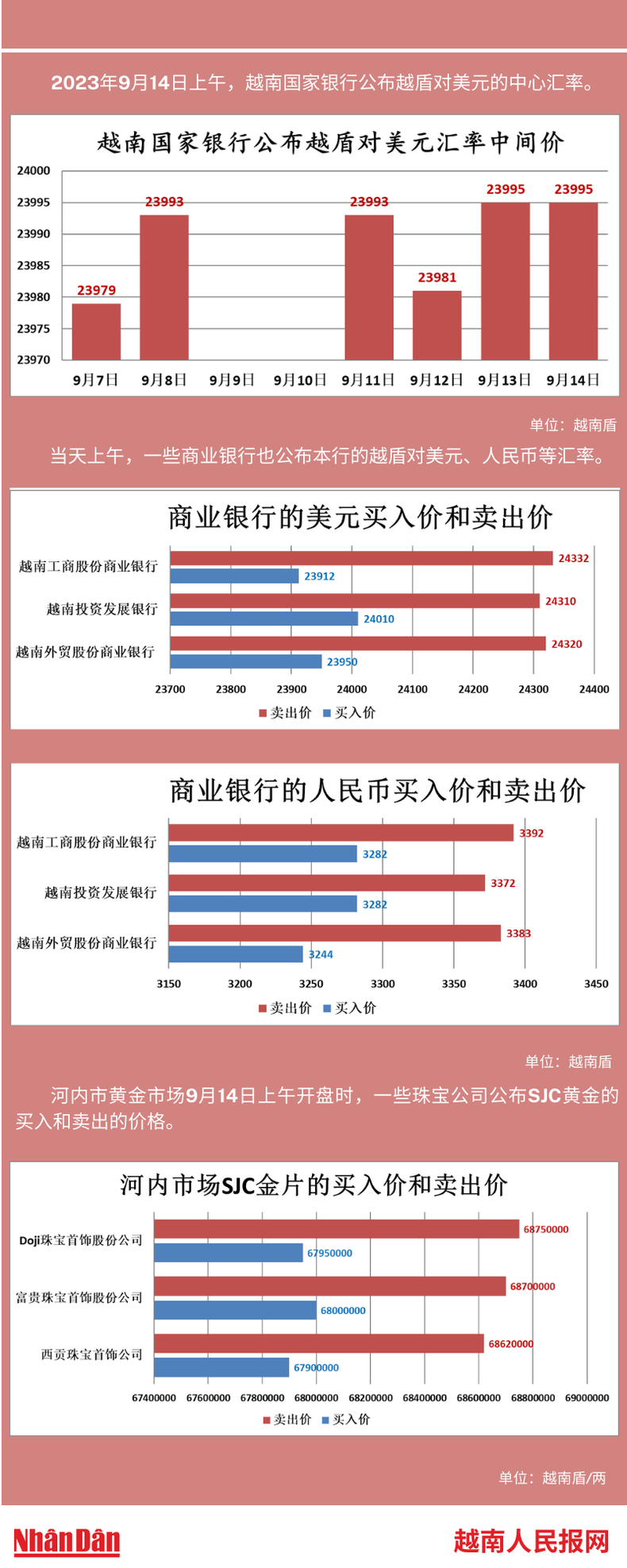 2023年9月14日上午,越南国家银行所公布的越盾对美元的中心汇率为23995。
