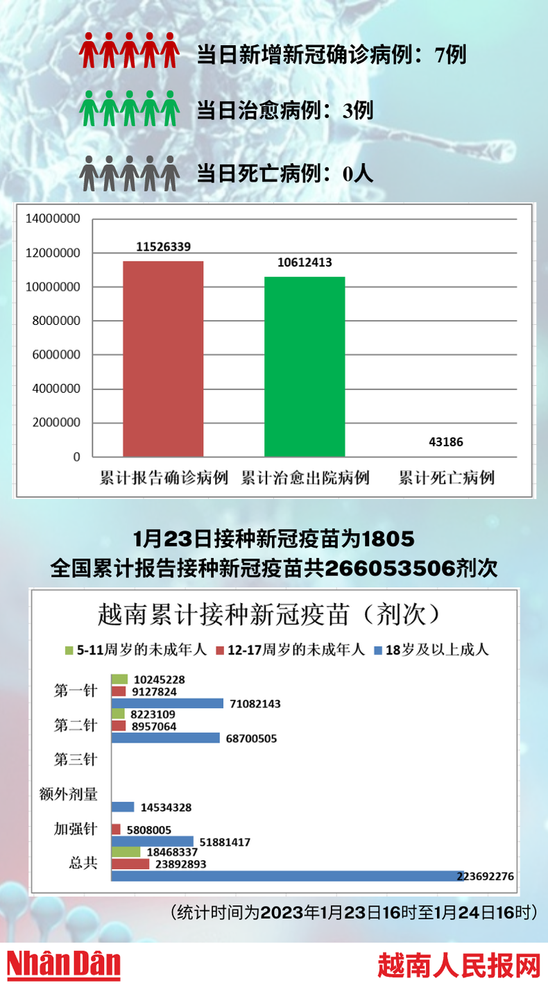 据越南卫生部1月24日下午公布的信息,当天越南新增新冠肺炎确诊病例为7例,新增治愈病例3例,无死亡病例。