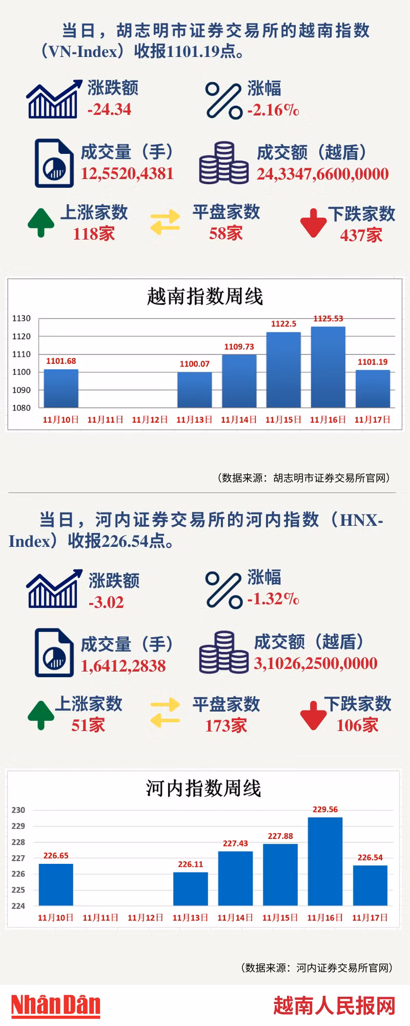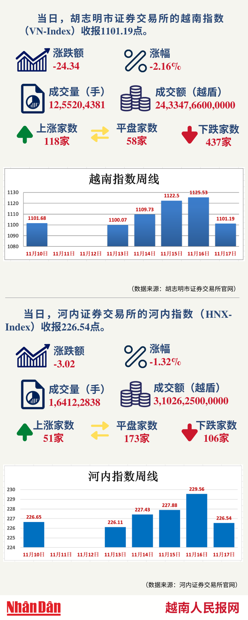当天,胡志明市证券交易所的越南指数(VN-Index)和河内证券交易所的河内指数(HNX-Index)分别收报1101.19点和226.54点。