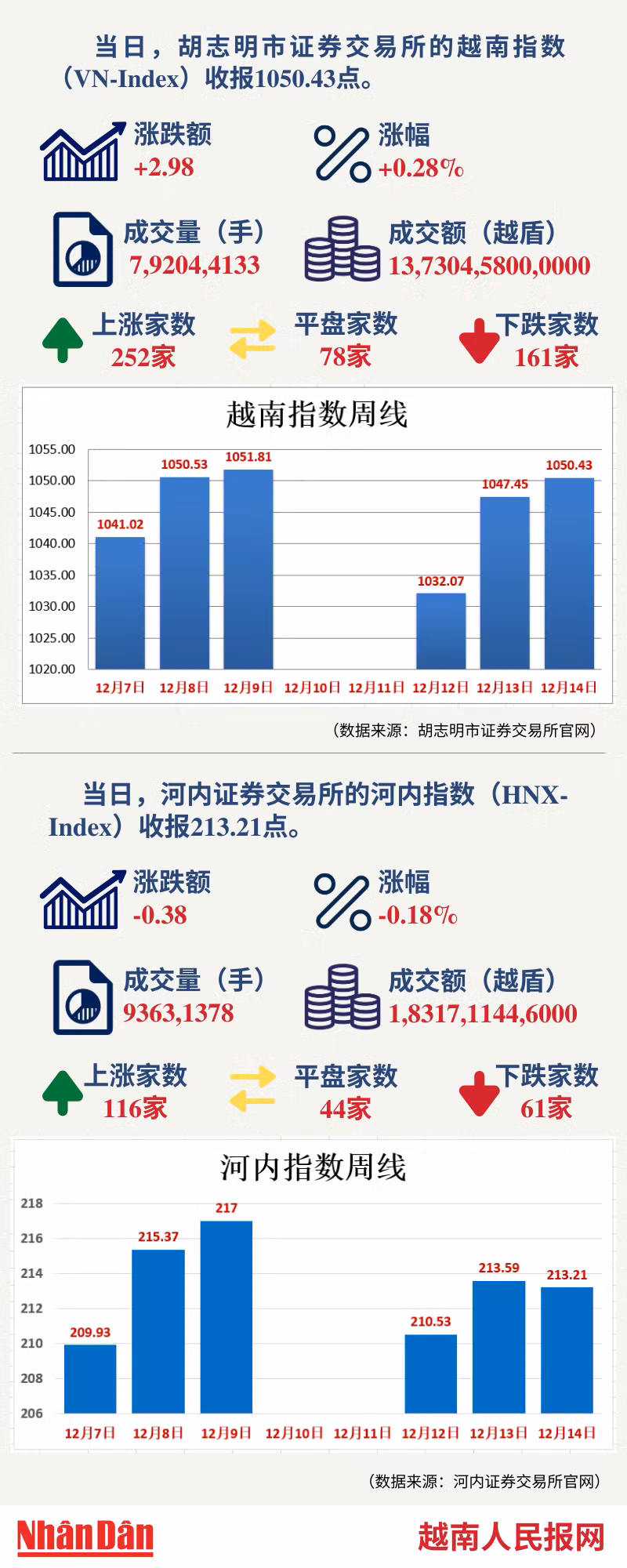当天,胡志明市证券交易所的越南指数(VN-Index)和河内证券交易所的河内指数(HNX-Index)分别收报1050.43点和213.21点。