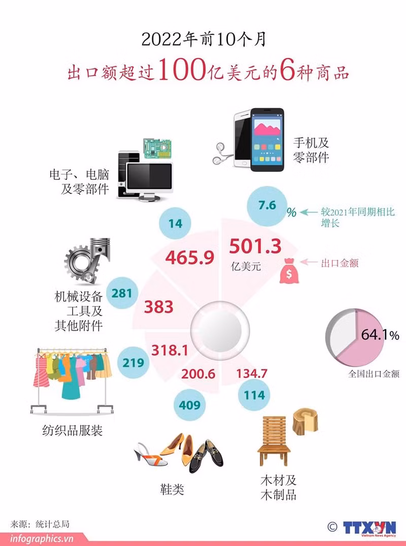 2022年前10月出口额超过100亿美元的6种商品【图表新闻】