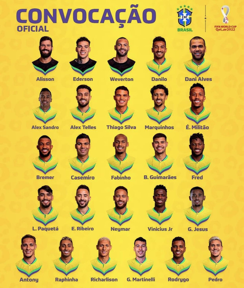前锋:内马尔(Neymar)、维尼修斯(Vinicius)、加布里埃尔·热苏斯(Gabriel Jesus)、安东尼(Antony)、拉菲尼亚(Raphinha)、理查利森(Richarlison)、加布里埃尔·马丁内利(Gabriel Martinelli)、罗德里戈(Rodrygo)、佩德罗(Pedro)