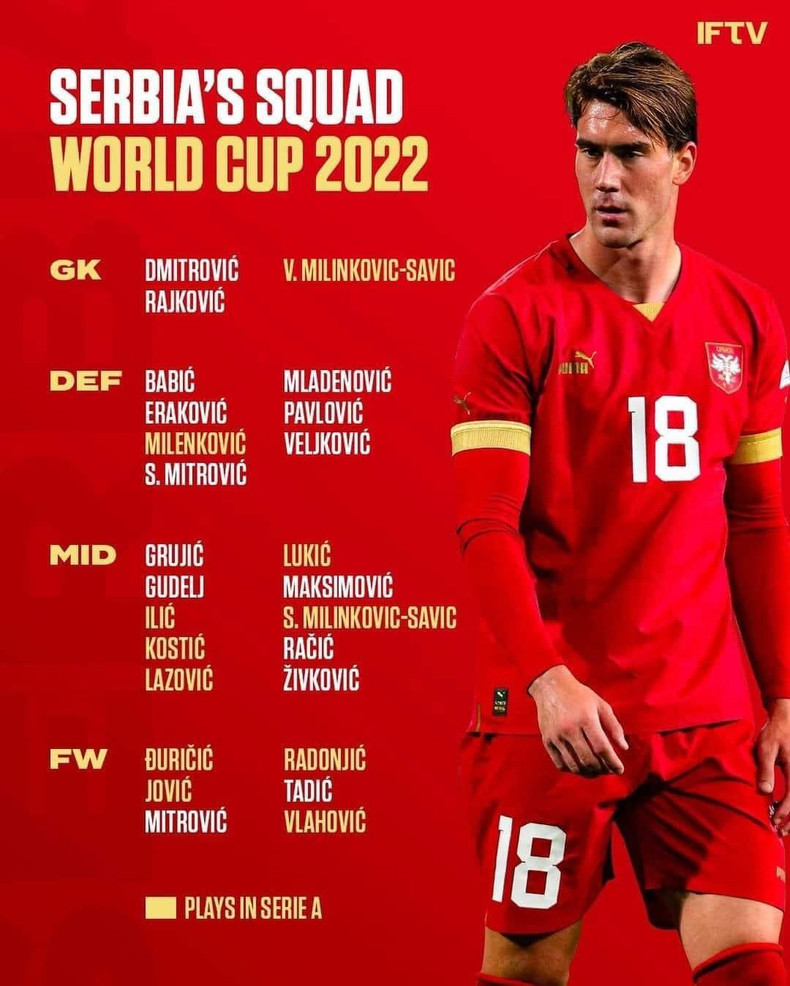 ♦ 本届世界杯塞尔维亚26人名单如下: