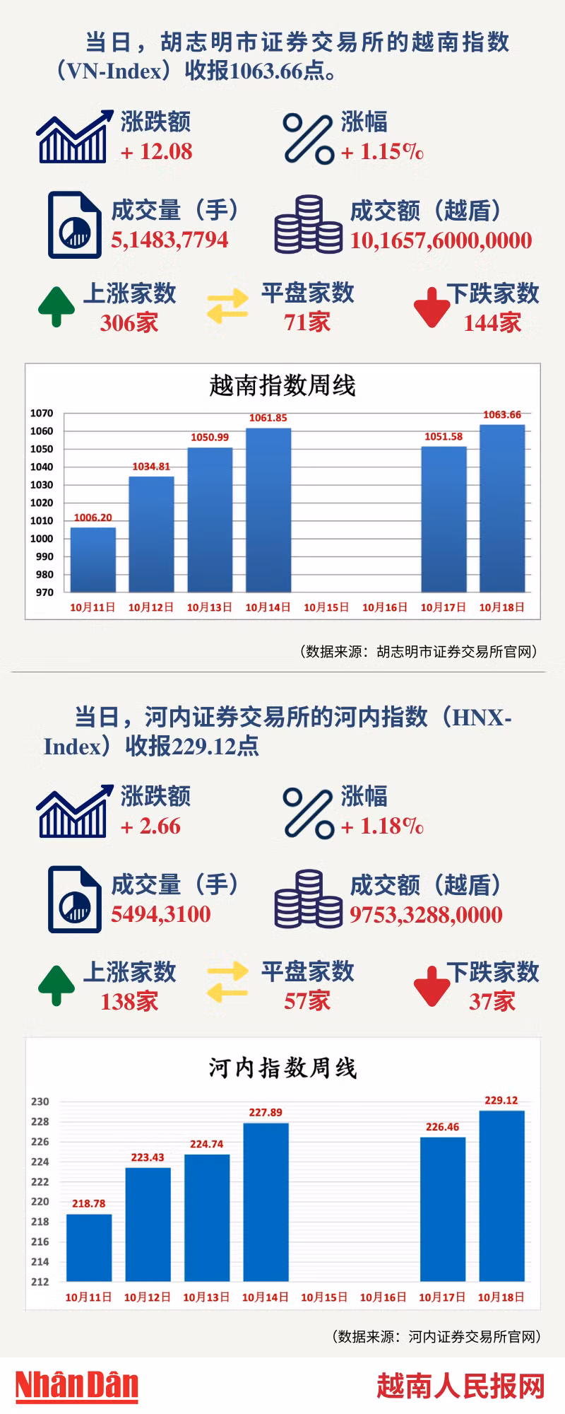 当天,胡志明市证券交易所的越南指数(VN-Index)和河内证券交易所的河内指数(HNX-Index)分别收报1063.66点和229.12点。