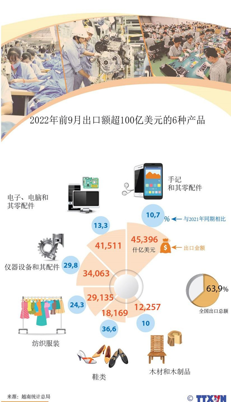 2022年前9月越南出口额超100亿美元的产品共6种【图表新闻】