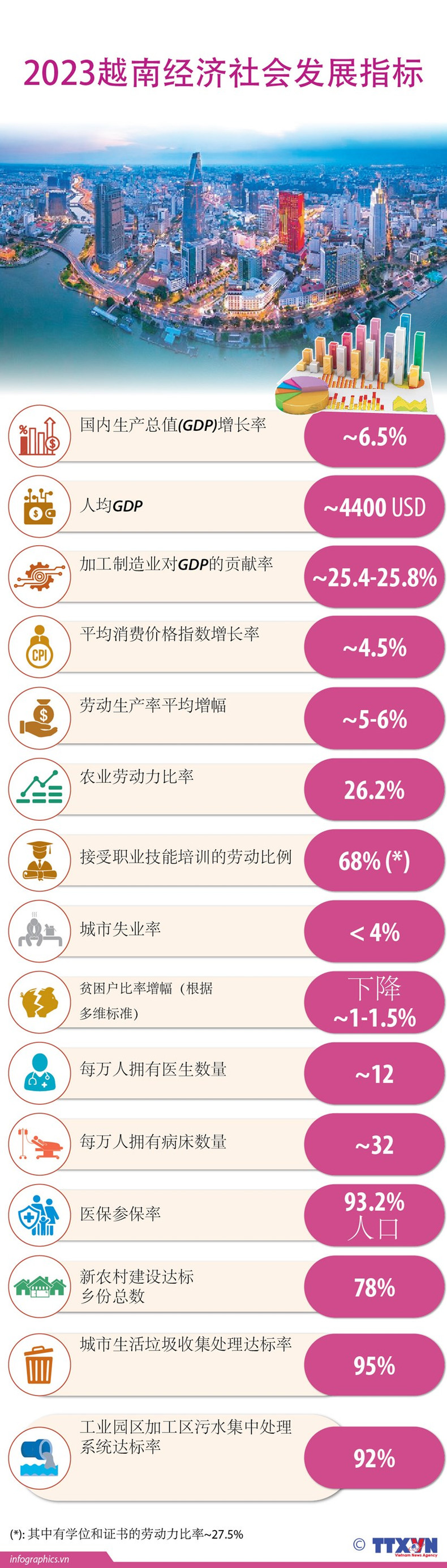 《2023年越南经济社会发展计划》提出的各项经济社会发展指标包括:国内生产总值增长6.5%,居民消费价格指数增长4.5%等。