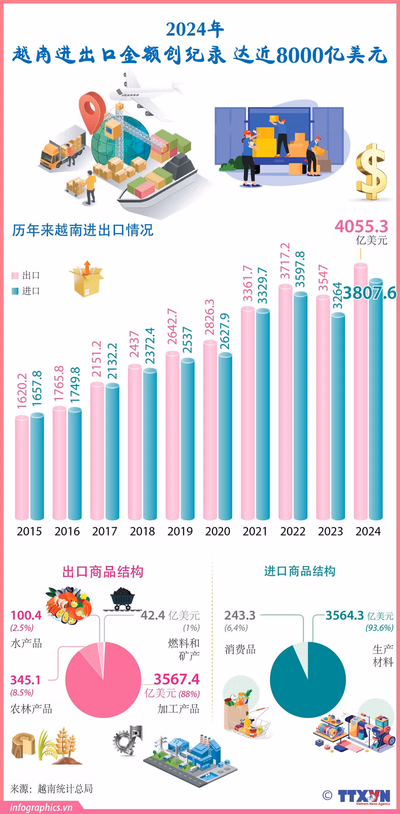 截至2024年底,越南货物进出口总额接近8000亿美元,创下了越南对外贸易的新纪录。