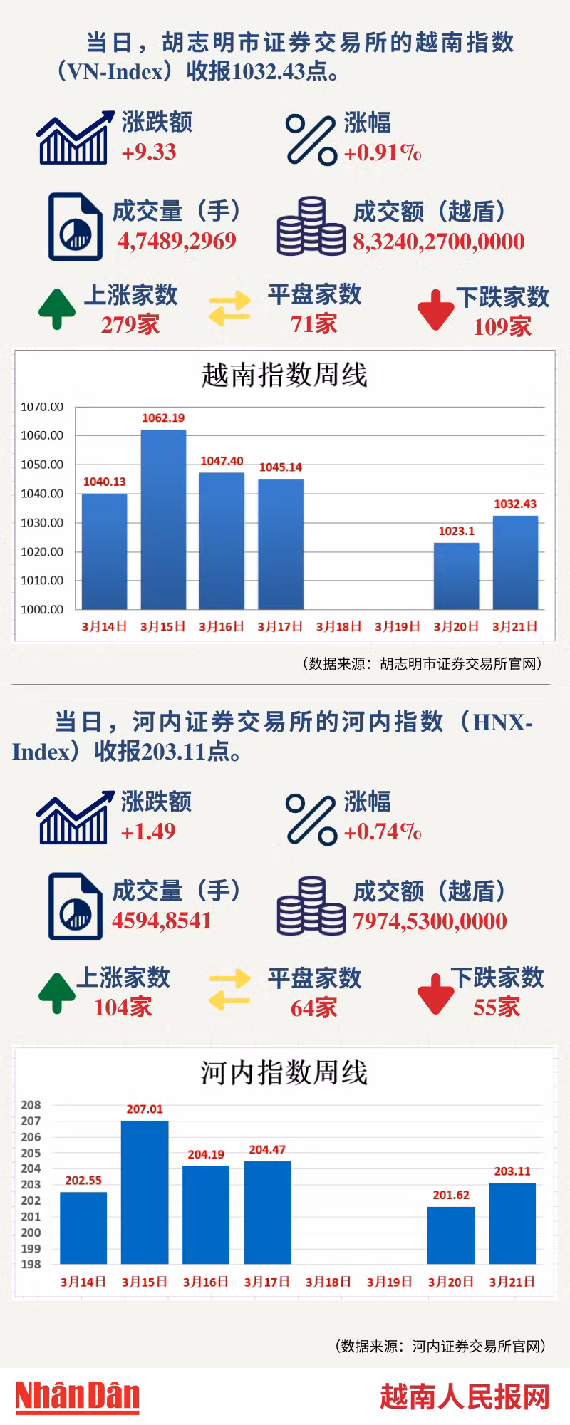 当天,胡志明市证券交易所的越南指数(VN-Index)和河内证券交易所的河内指数(HNX-Index)分别收报1032.43点和203.11点。