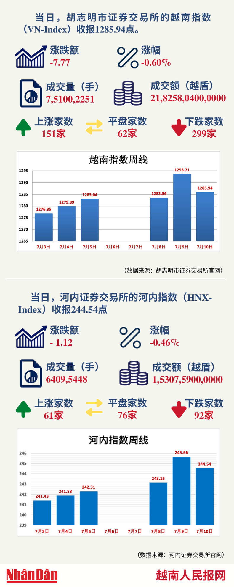 2025年12月10日星期三 21:34 12月10日越南证券市场数据一览 【图表新闻】 当天,胡志明市证券交易所的越南指数(VN-Index)和河内证券交易所的河内指数(HNX-Index)分别收报1718.98点和256.48点。