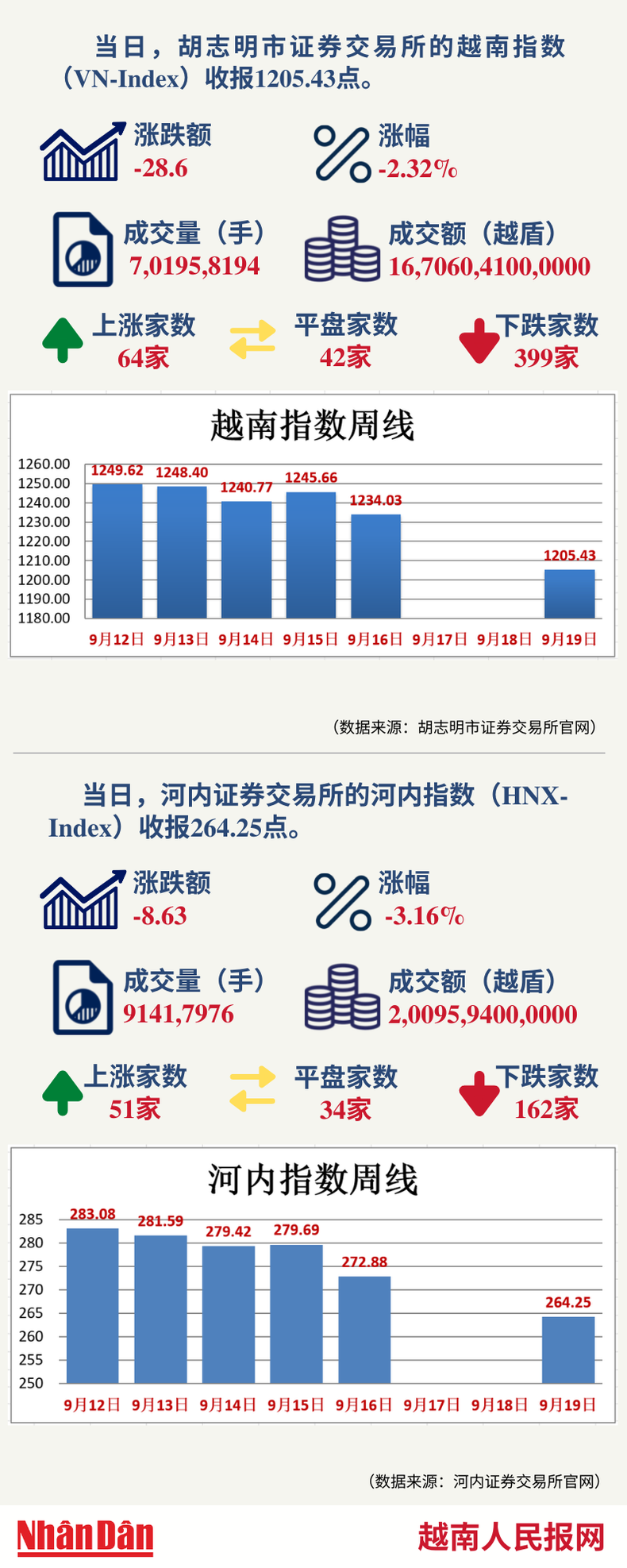 当天,胡志明市证券交易所的越南指数(VN-Index)和河内证券交易所的河内指数(HNX-Index)分别收报1205.43点和264.25点。