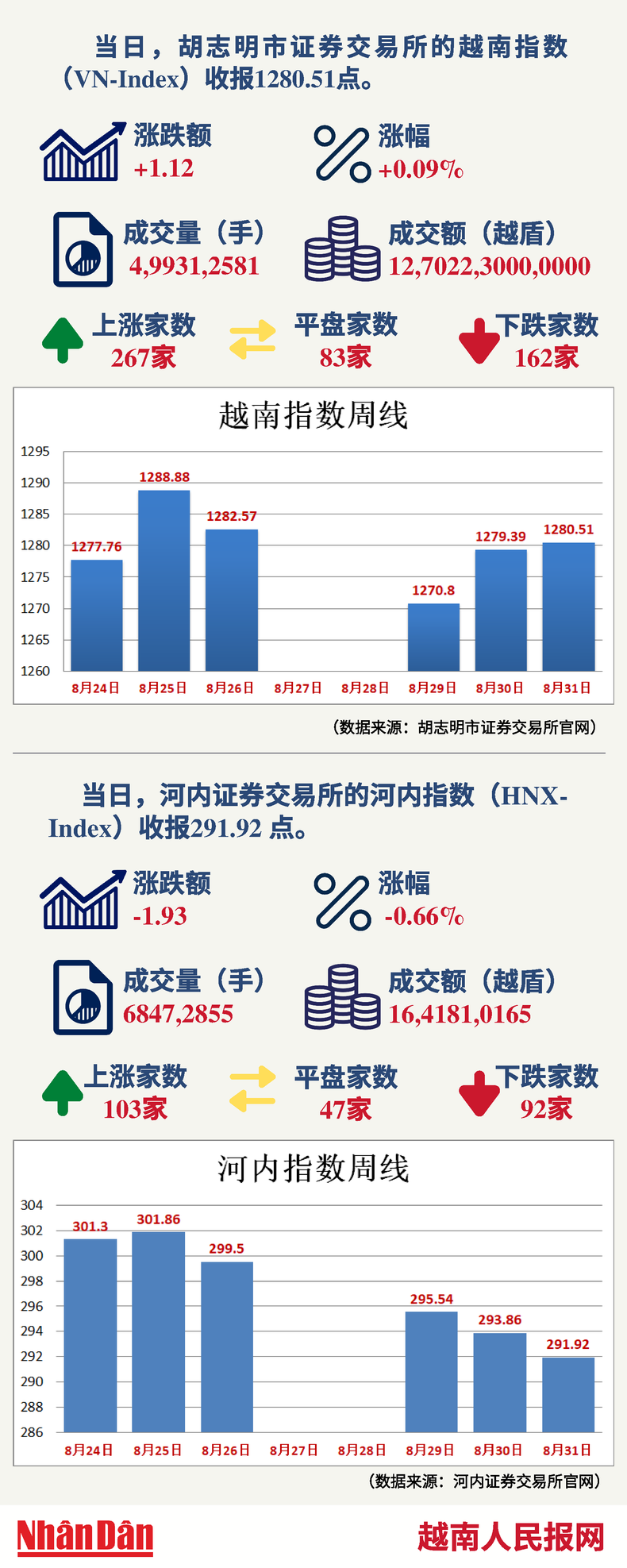当天,胡志明市证券交易所的越南指数(VN-Index)和河内证券交易所的河内指数(HNX-Index)分别收报1280.51点和291.92点。