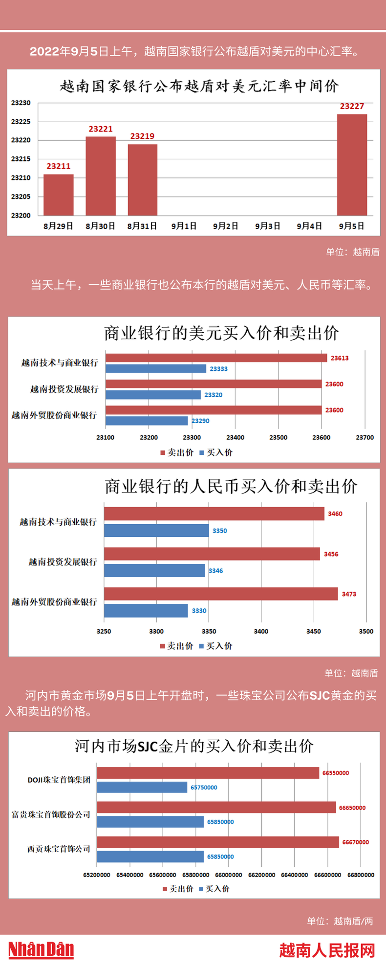 2022年9月5日上午,越南国家银行所公布的越盾对美元的中心汇率为 23227。
