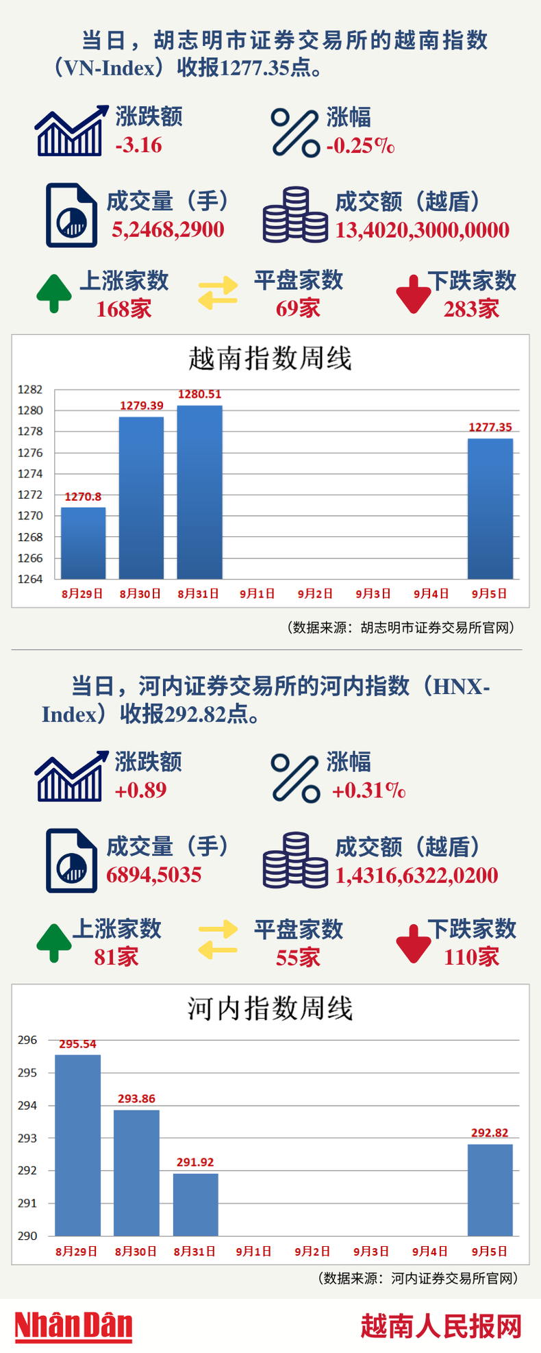 当天,胡志明市证券交易所的越南指数(VN-Index)和河内证券交易所的河内指数(HNX-Index)分别收报1277.35点和292.82点。