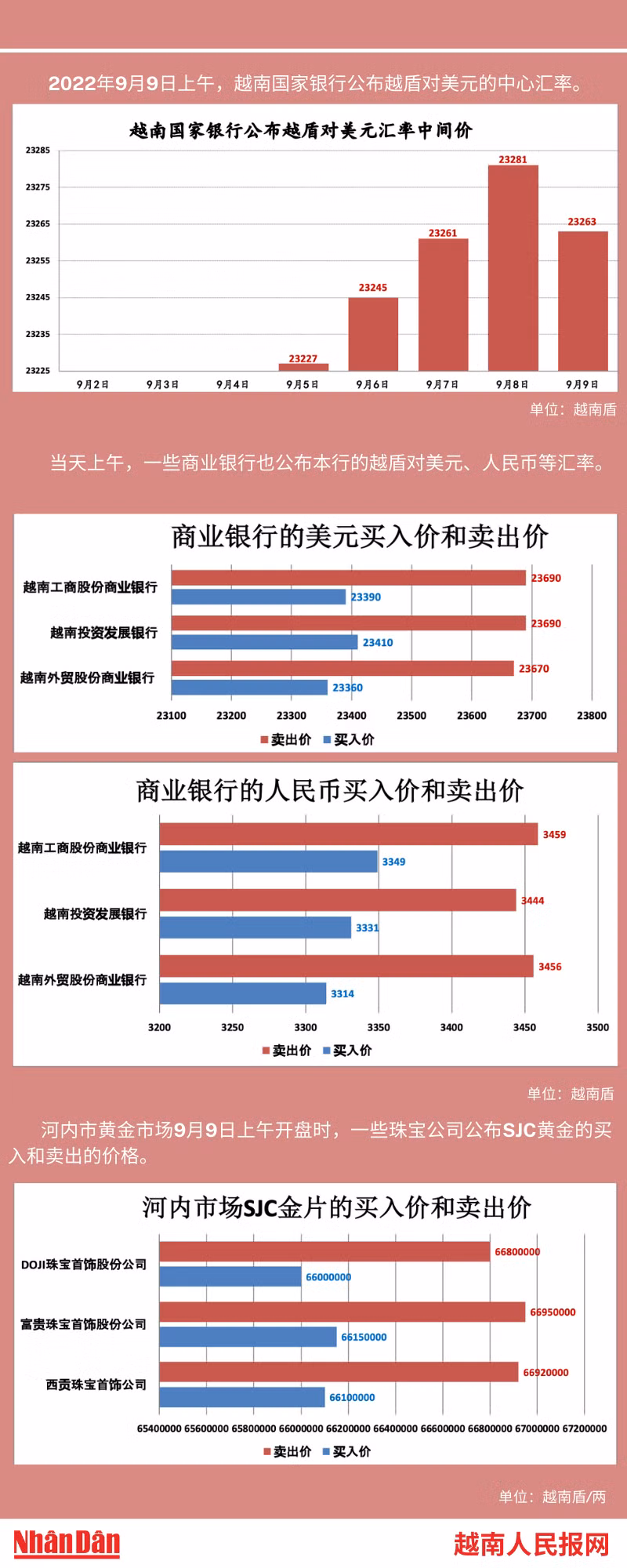 2022年9月9日上午,越南国家银行所公布的越盾对美元的中心汇率为23263。