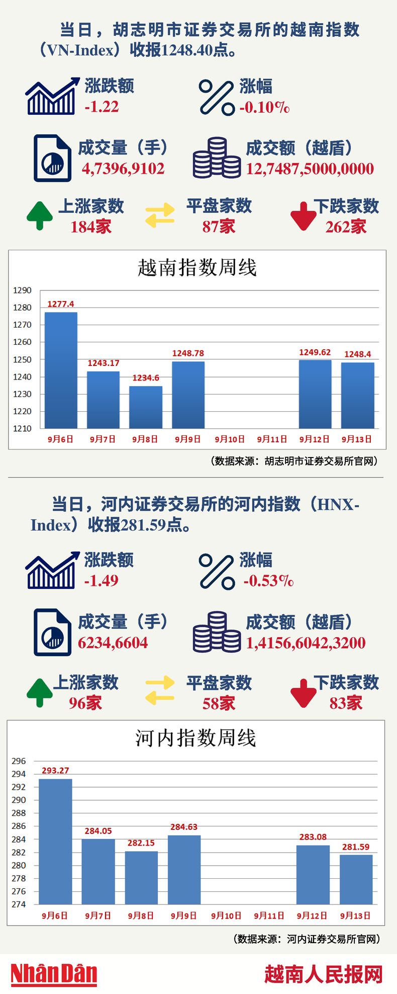 当天,胡志明市证券交易所的越南指数(VN-Index)和河内证券交易所的河内指数(HNX-Index)分别收报1248.4点和281.59点。