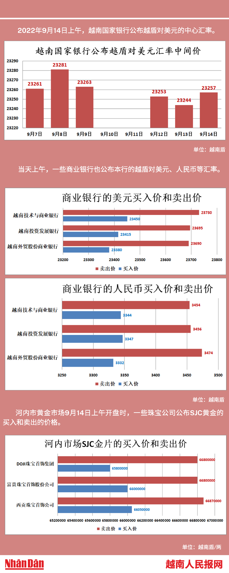 2022年9月14日上午,越南国家银行所公布的越盾对美元的中心汇率为23257。