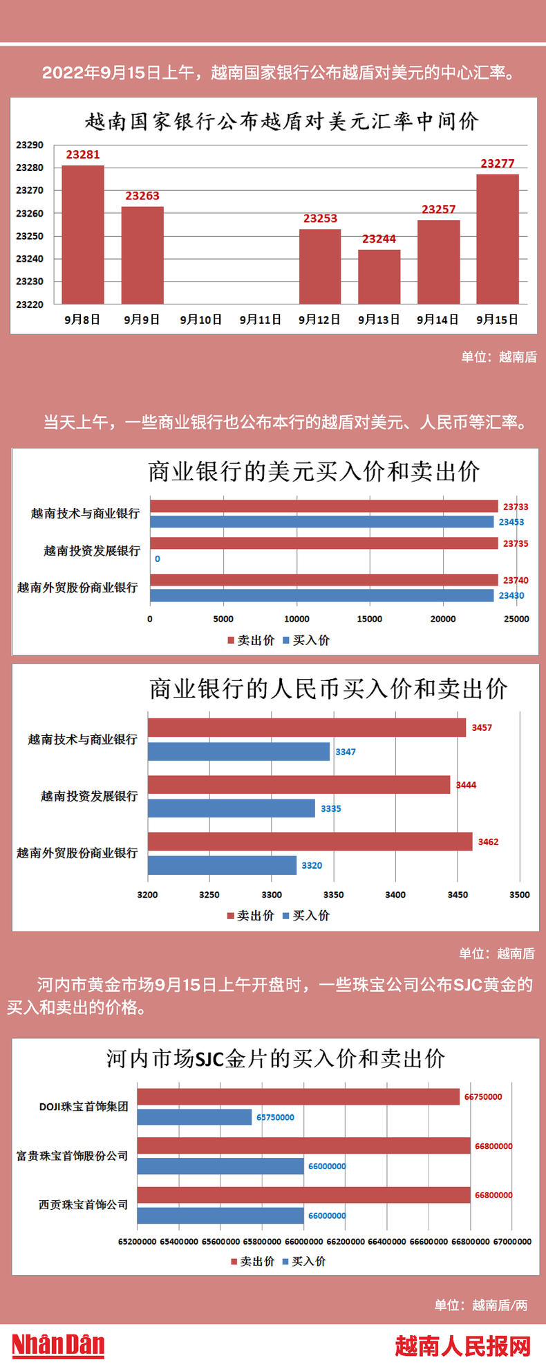 2022年9月15日上午,越南国家银行所公布的越盾对美元的中心汇率为23277。