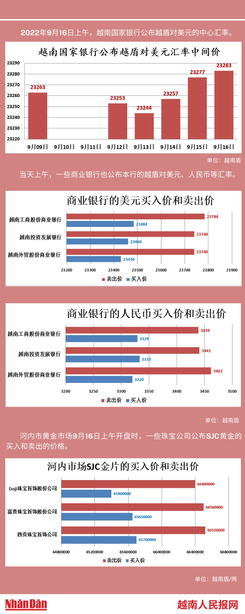 2022年9月16日上午,越南国家银行所公布的越盾对美元的中心汇率为23283。