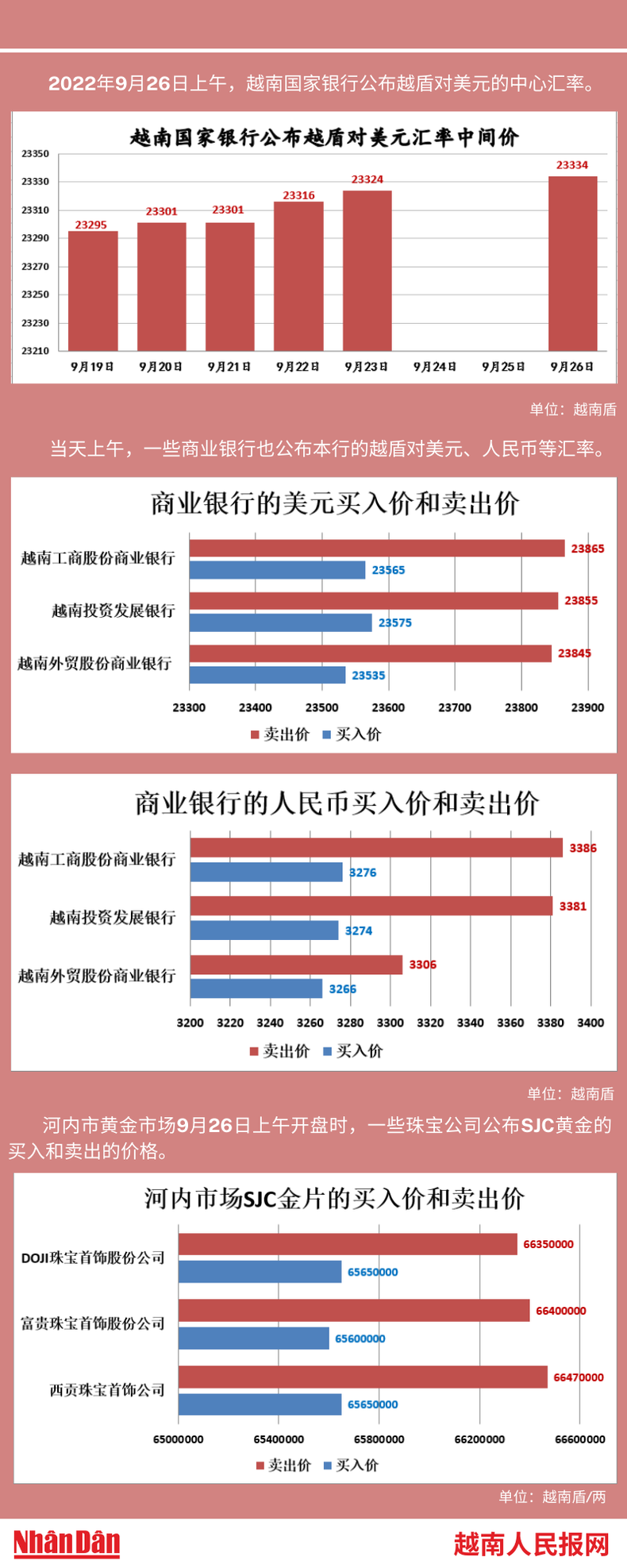2022年9月26日上午,越南国家银行所公布的越盾对美元的中心汇率为23334。