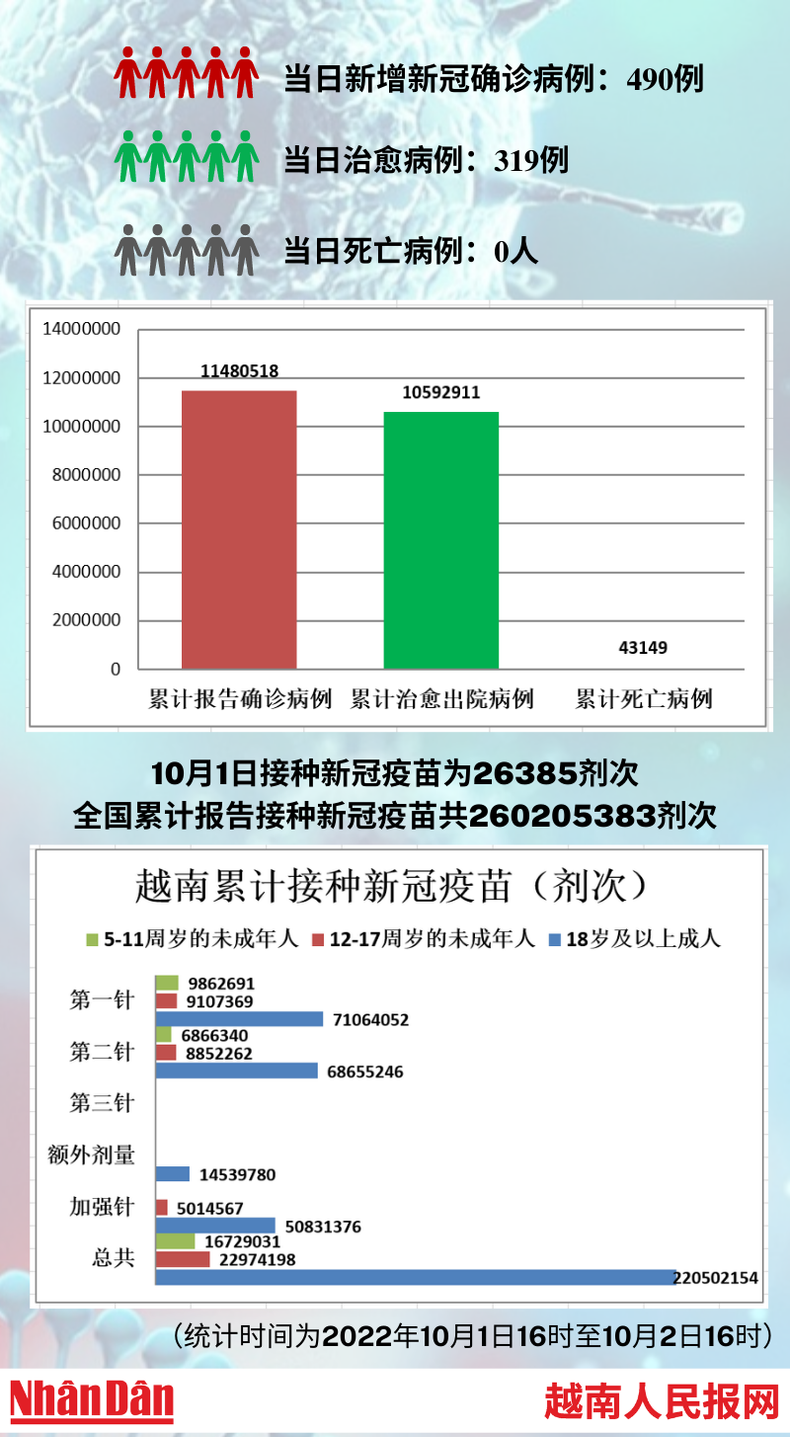 据越南卫生部10月2日下午公布的信息,当天越南新增新冠肺炎确诊病例为490例,新增治愈病例319例,无死亡病例。