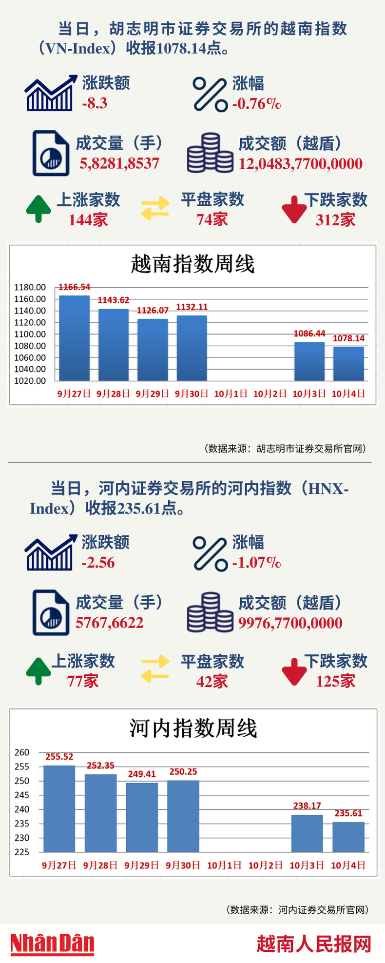 当天,胡志明市证券交易所的越南指数(VN-Index)和河内证券交易所的河内指数(HNX-Index)分别收报1078.14点和235.61点。