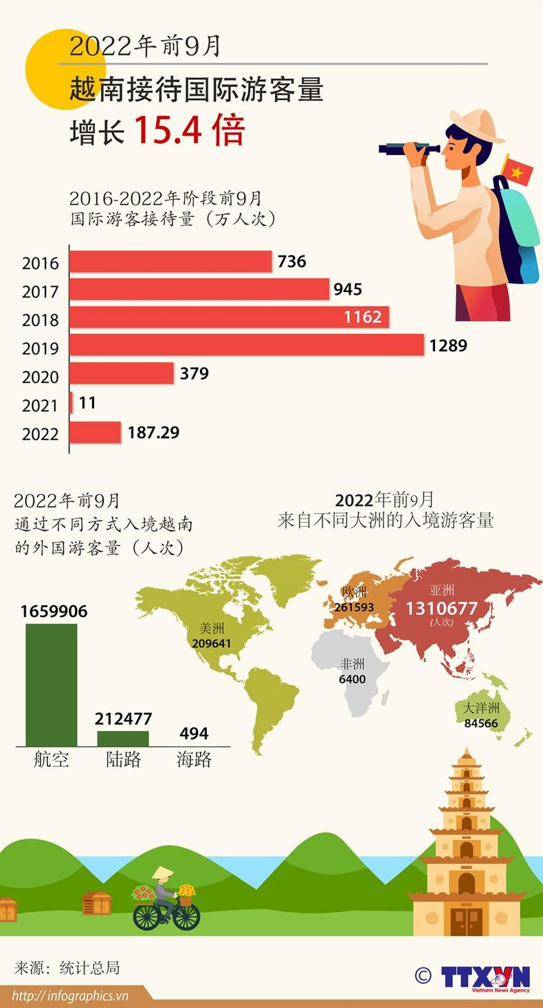2022年前9月越南接待国际游客量增长15.4倍【图表新闻】
