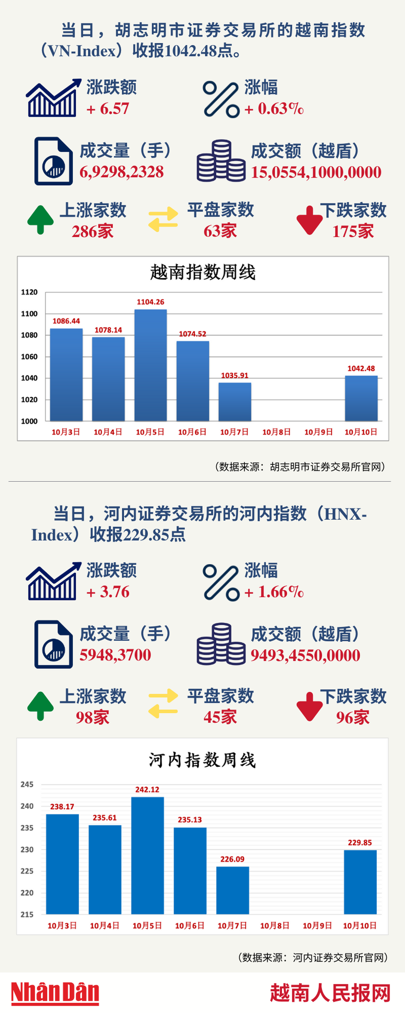 当天,胡志明市证券交易所的越南指数(VN-Index)和河内证券交易所的河内指数(HNX-Index)分别收报1042.48点和229.85点。