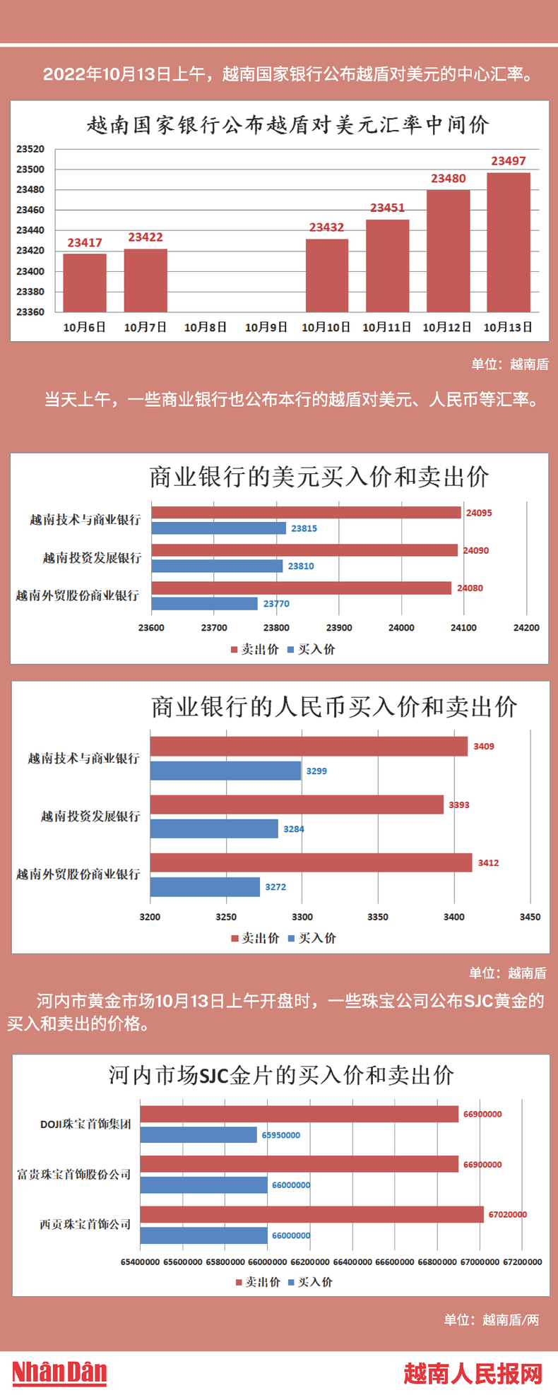 2022年10月13日上午,越南国家银行所公布的越盾对美元的中心汇率为23497。