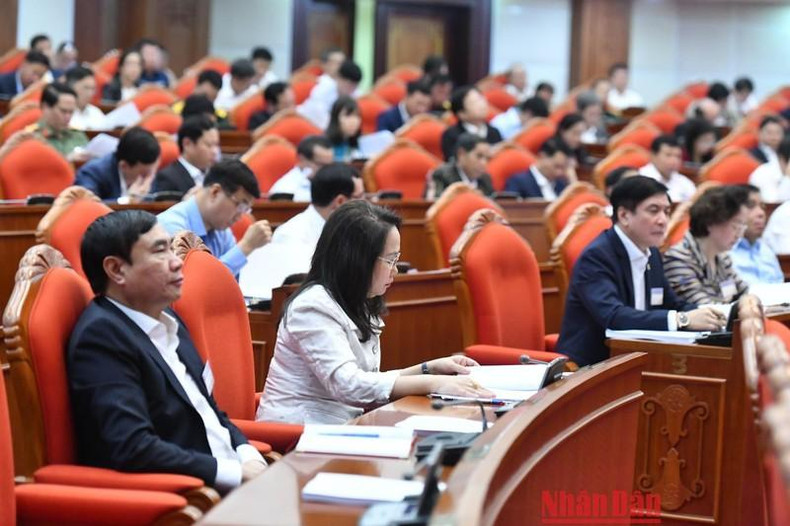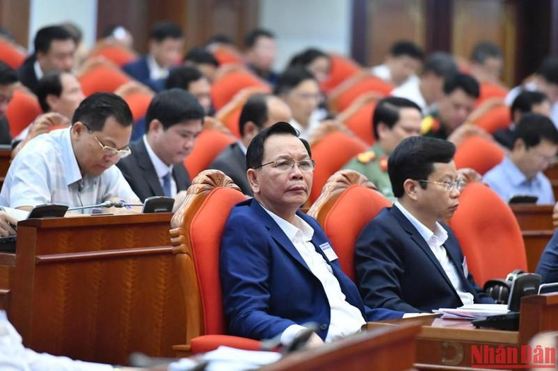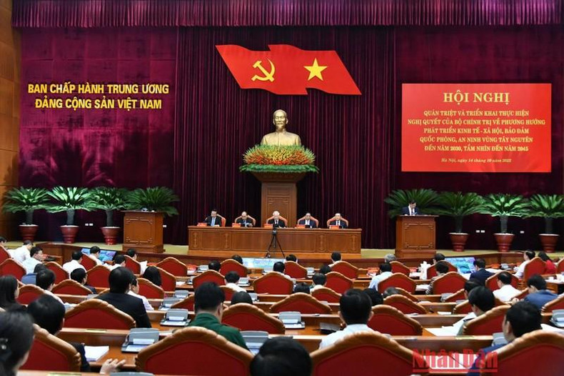 越共中央总书记阮富仲,国家主席阮春福,政府总理范明正,国会主席王廷惠,越共中央政治局委员、中央书记处常务书记武文赏共同主持会议。