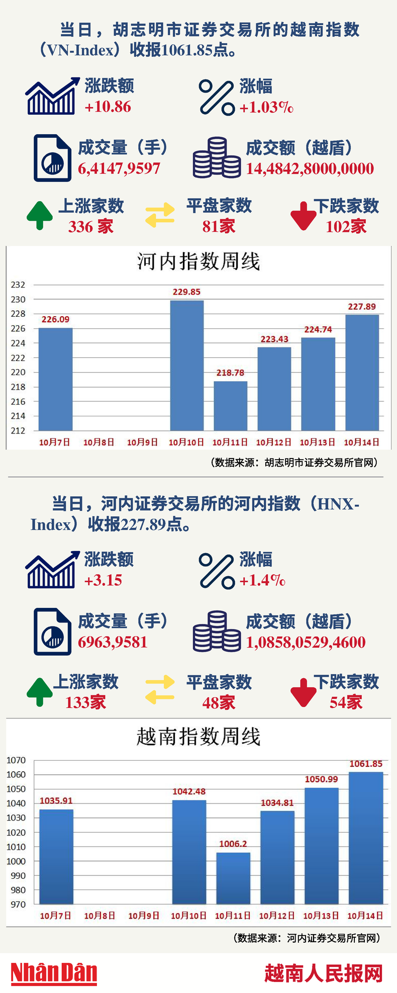 当天,胡志明市证券交易所的越南指数(VN-Index)和河内证券交易所的河内指数(HNX-Index)分别收报1061.85点和227.89点。