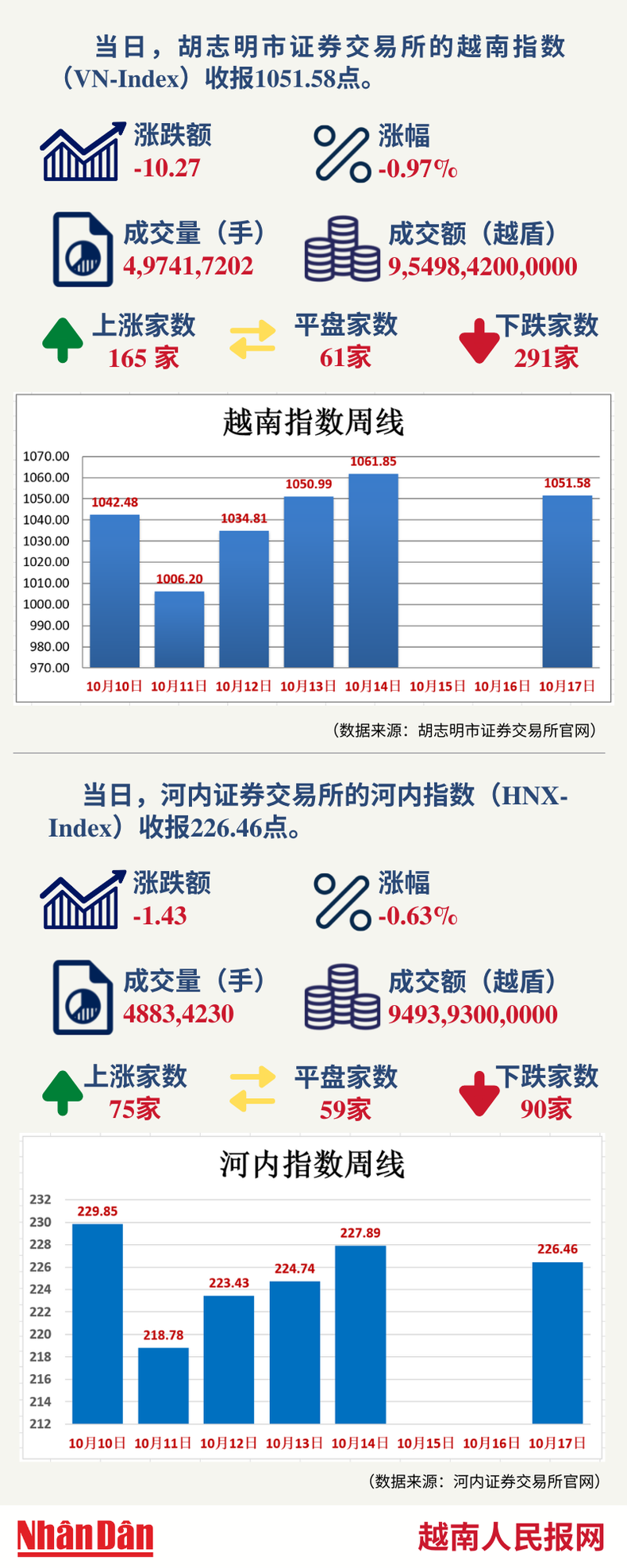 当天,胡志明市证券交易所的越南指数(VN-Index)和河内证券交易所的河内指数(HNX-Index)分别收报1051.58点和226.46点。