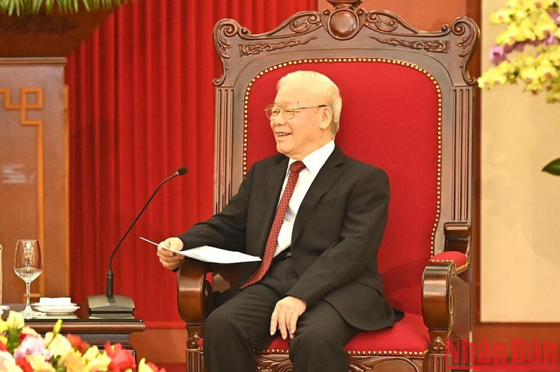 阮富仲总书记在会见中发言。