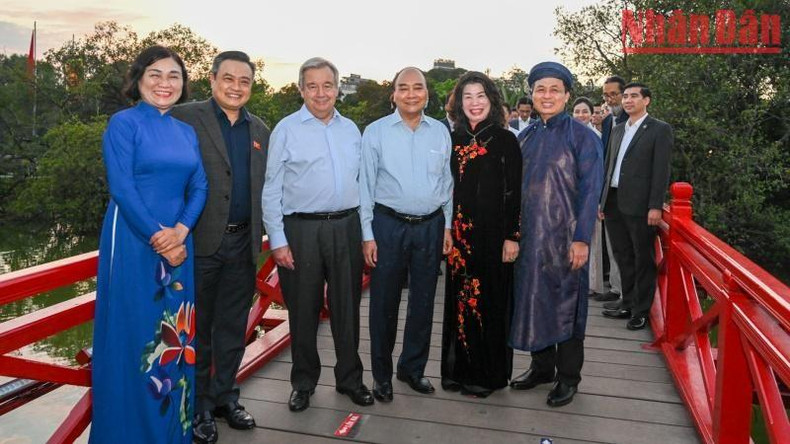 国家主席阮春福和联合国秘书长安东尼奥·古特雷斯参观栖旭桥。