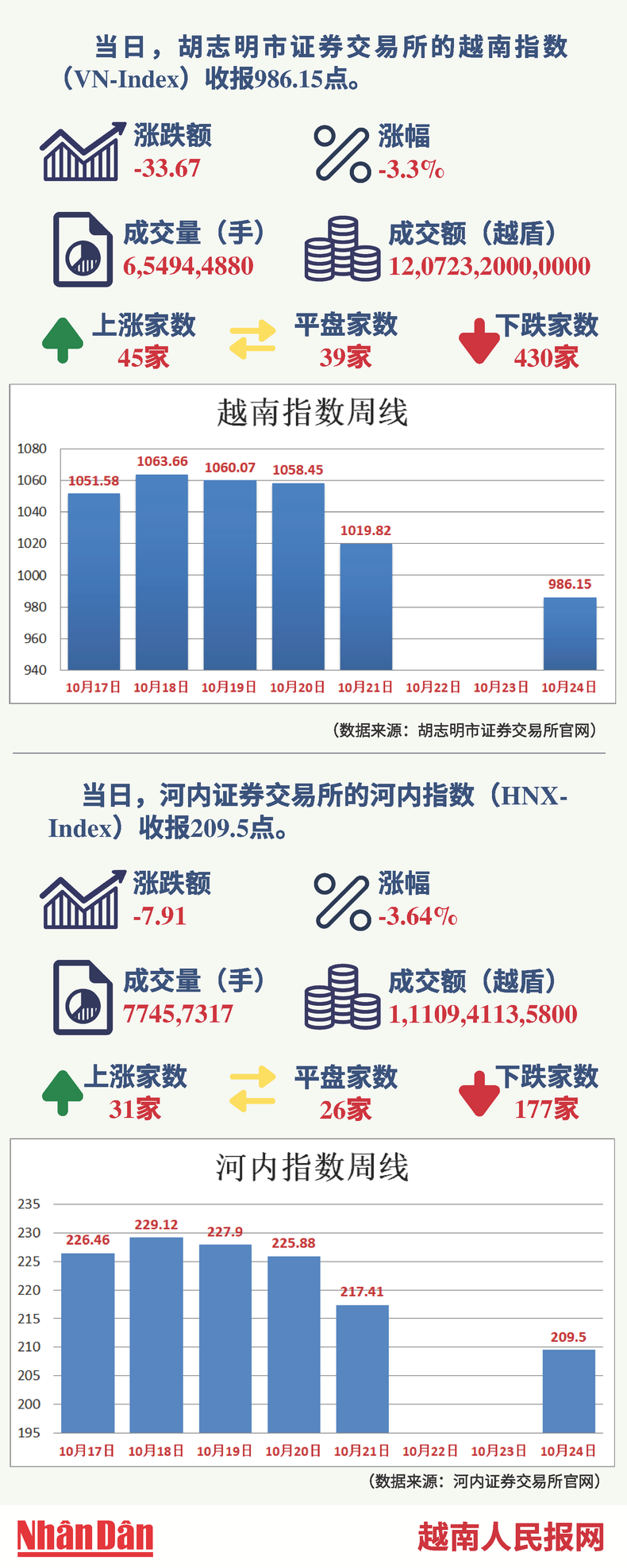 当天,胡志明市证券交易所的越南指数(VN-Index)和河内证券交易所的河内指数(HNX-Index)分别收报986.15点和209.5点。