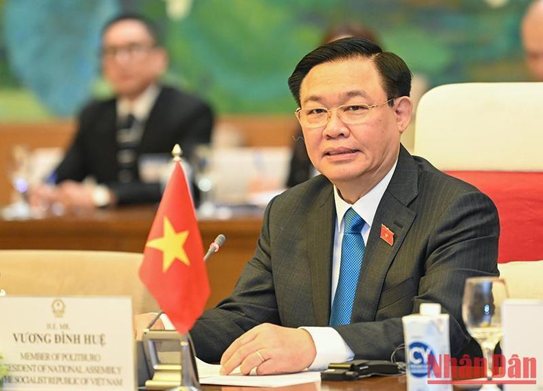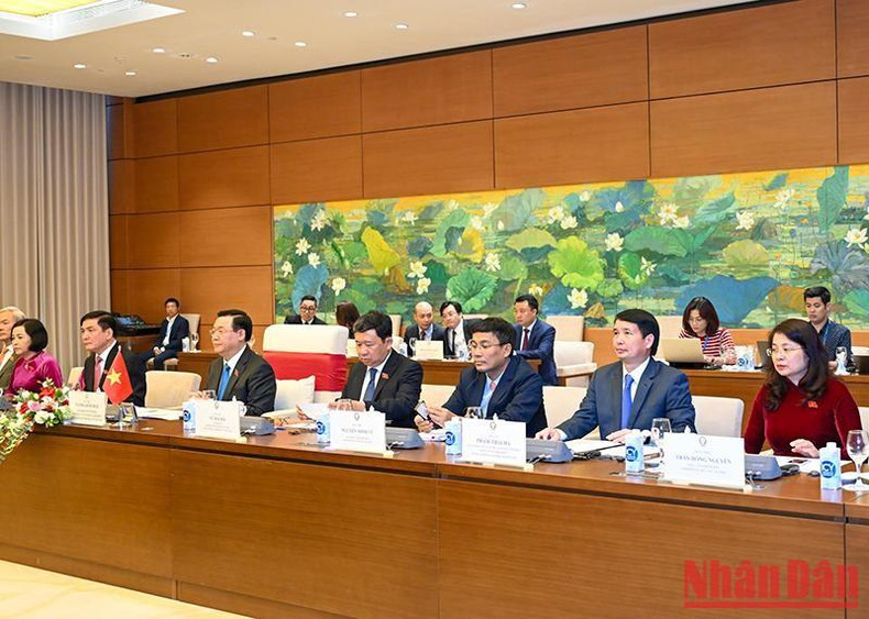 国会主席王廷惠向柬埔寨参议院主席赛冲介绍越南代表团成员。