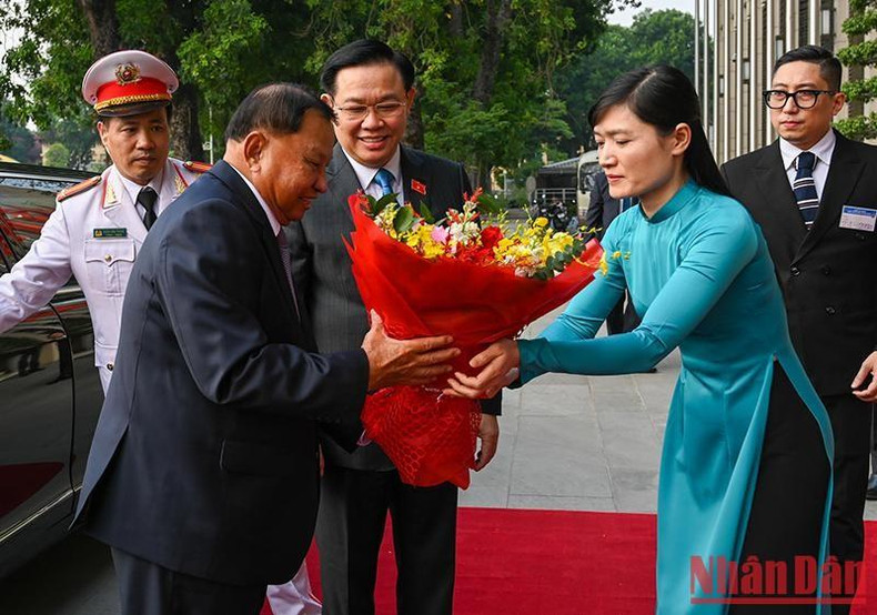 越南国会办公厅的工作人员向柬埔寨参议院主席赛冲赠送鲜花。
